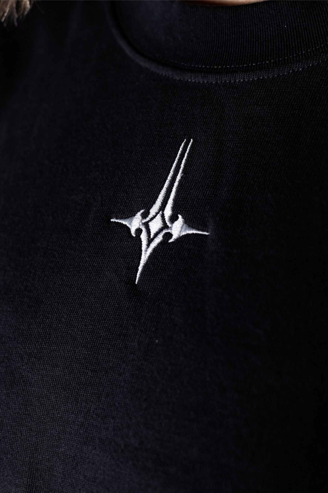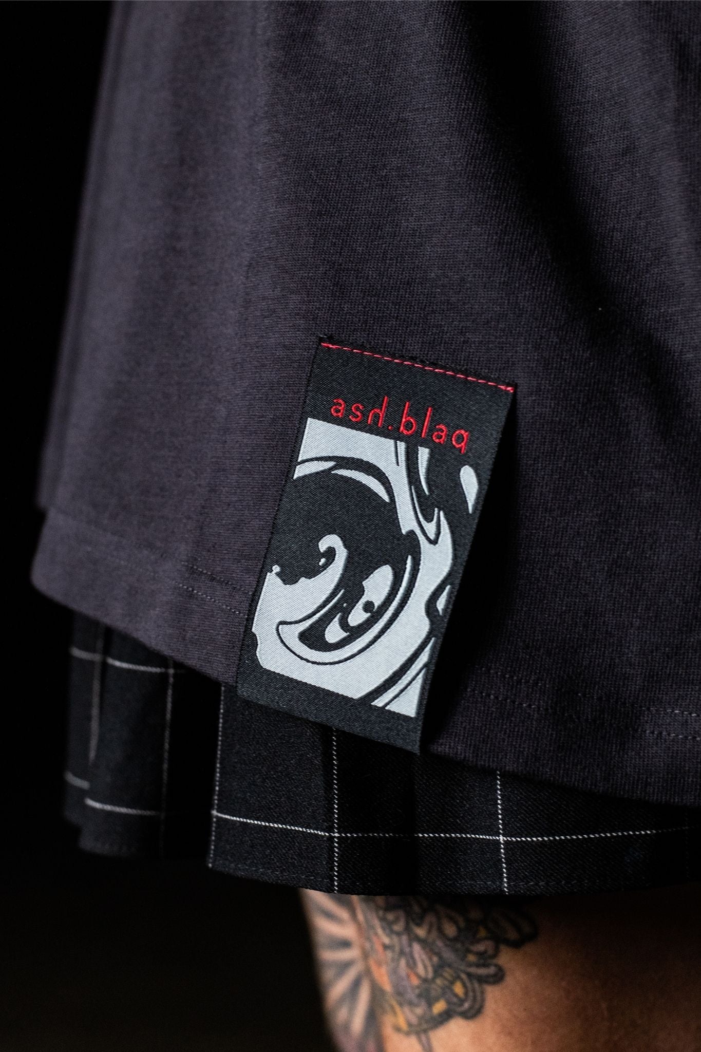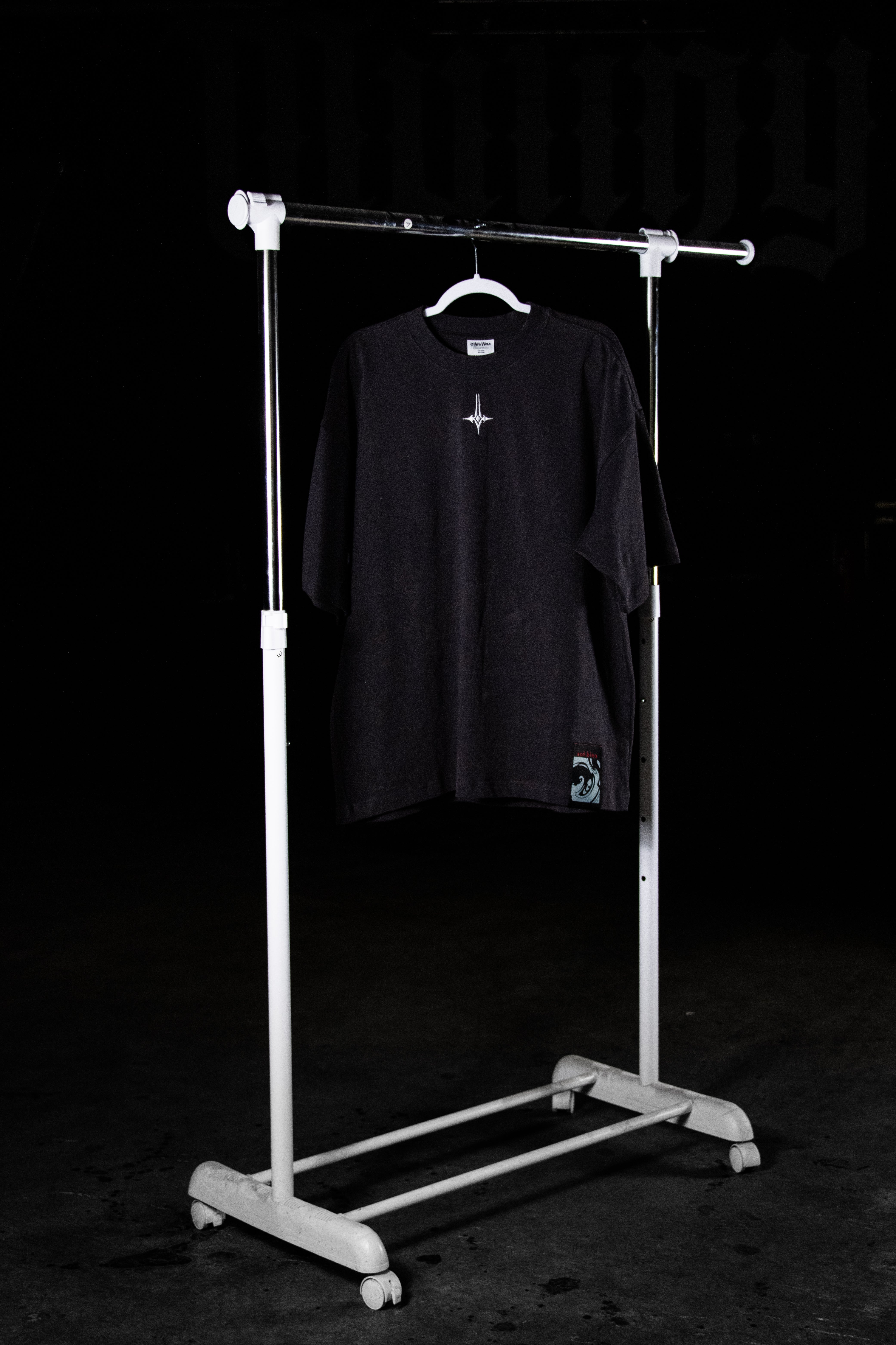 The panels are sewn directly into the back of the shirt, creating a bold, graphic composition that feels sculptural and alive. The front features her embroidered ash.blaq sigil and a custom oversized hem tag for a refined streetwear finish.