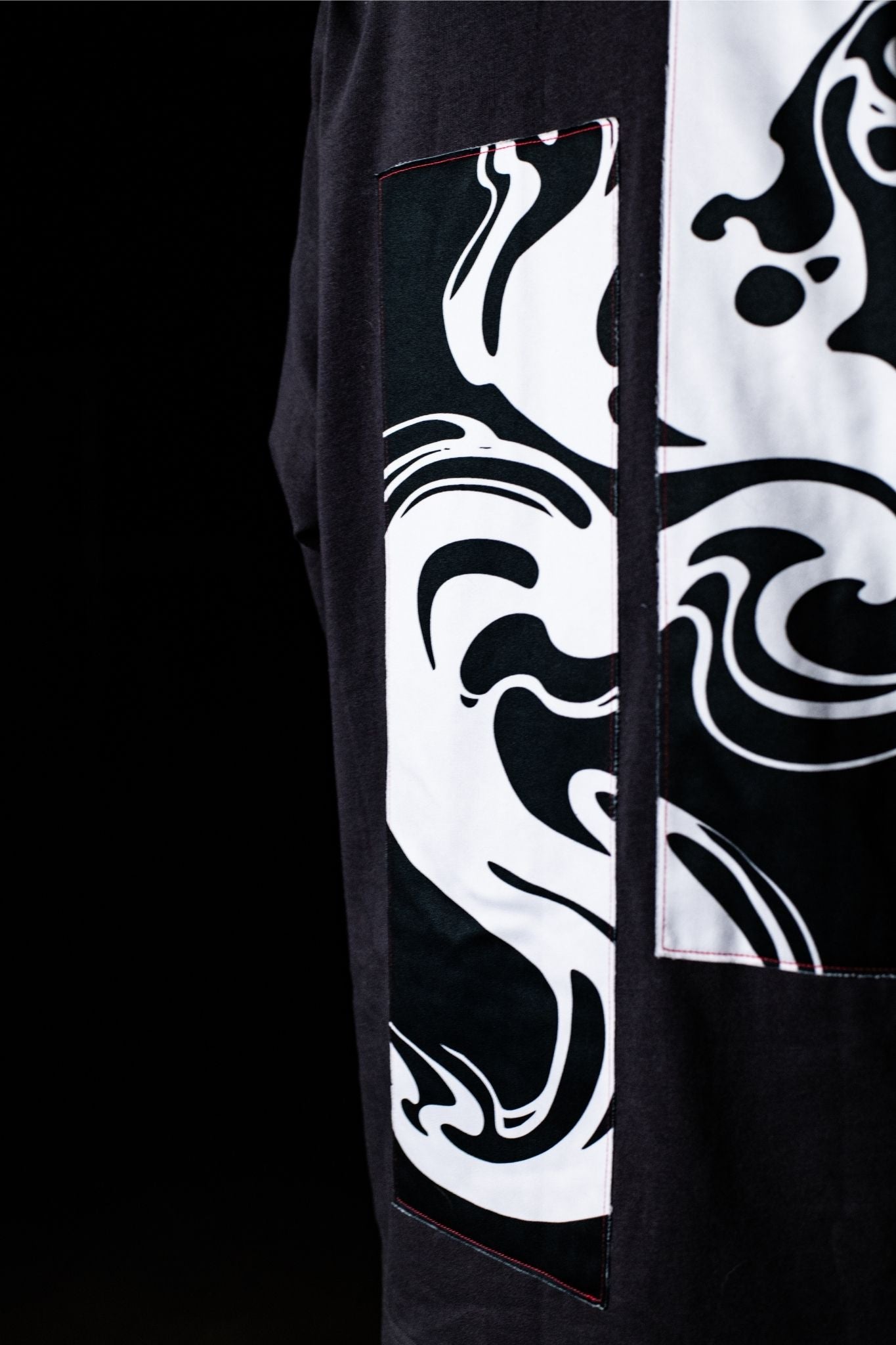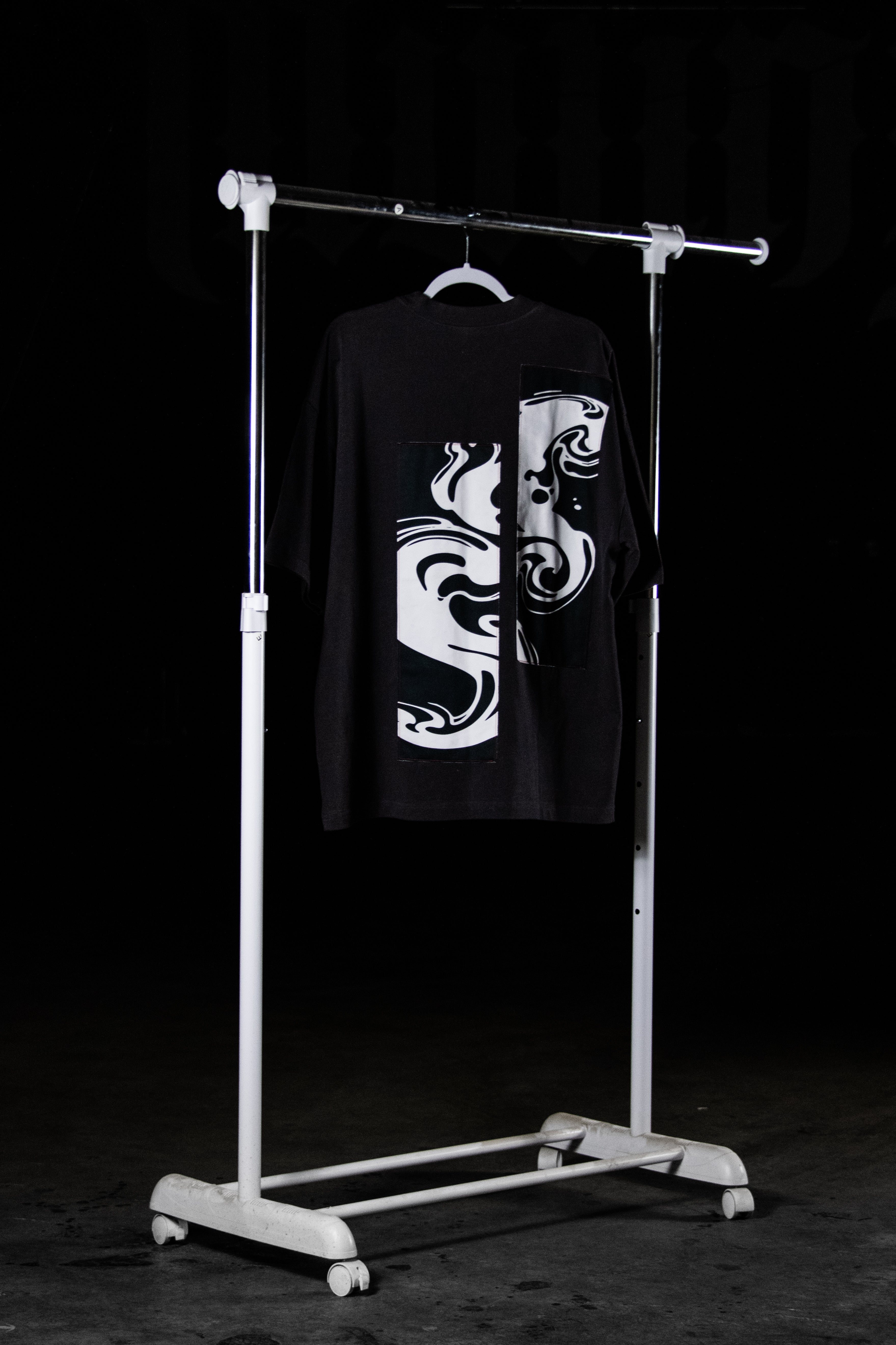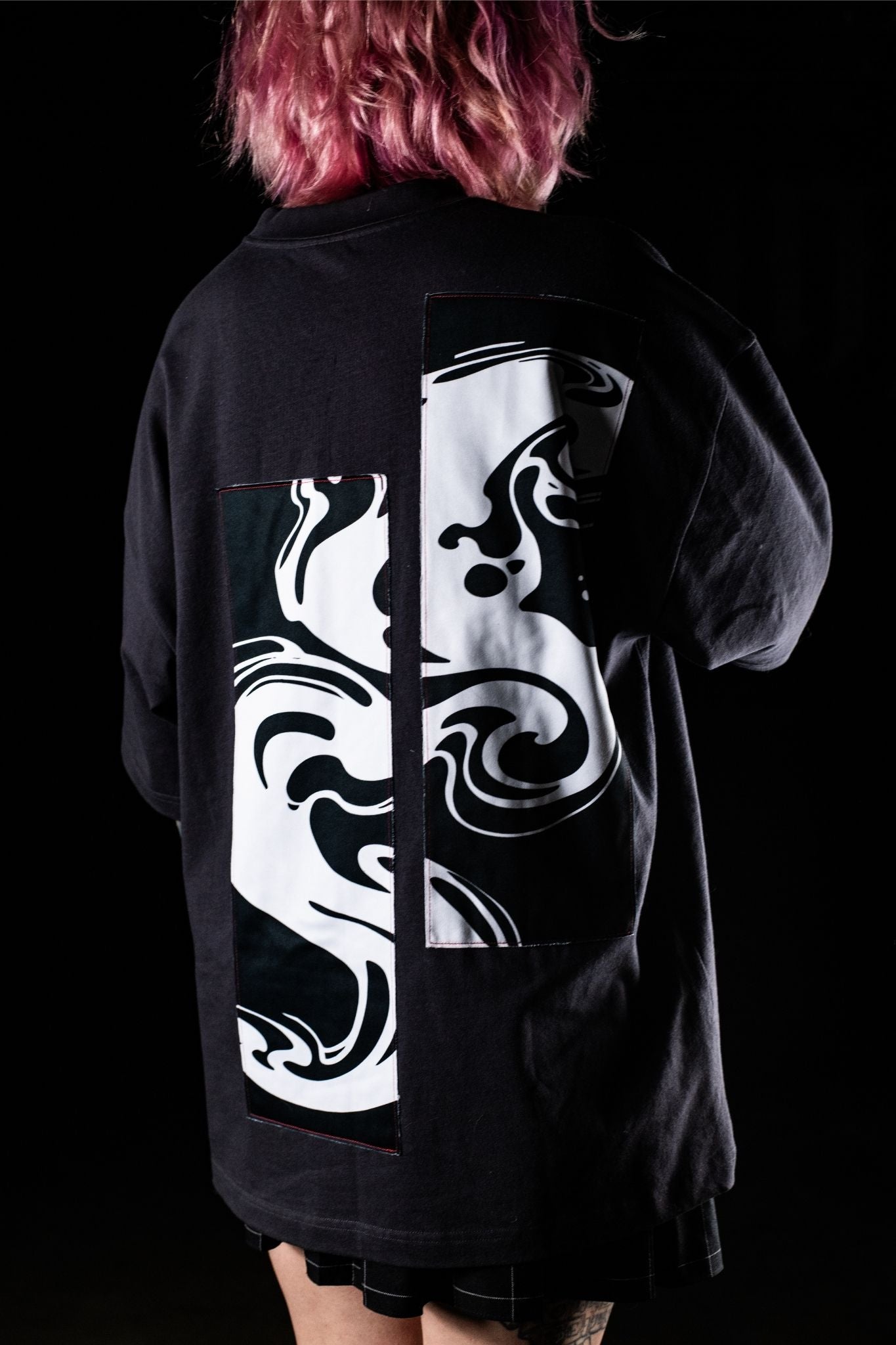 Each oversized charcoal tee is transformed with two hand-sewn back panels showcasing her signature flowing blackwork - an expression rooted in the natural movement of water, duality, and the quiet power of organic forms.